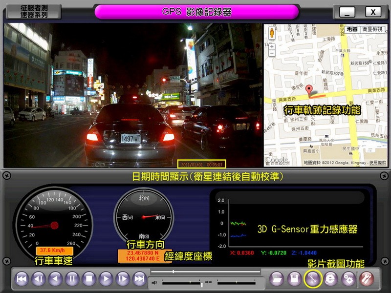 ●整合播放:播放軟體可同步播出側錄影音、Google Map行車軌跡、G-sensor震動感應。