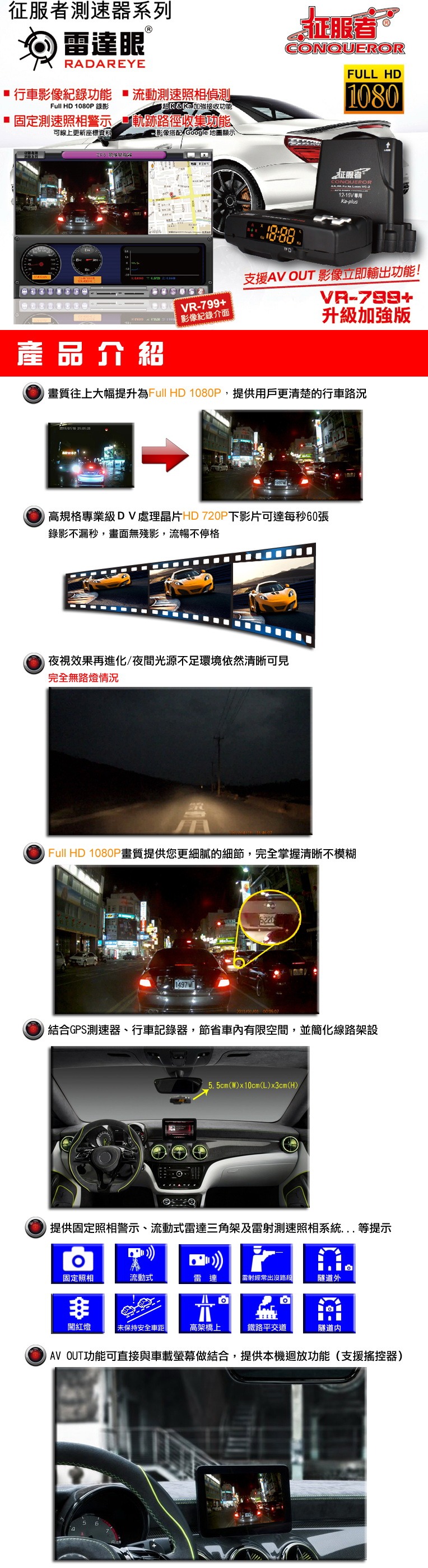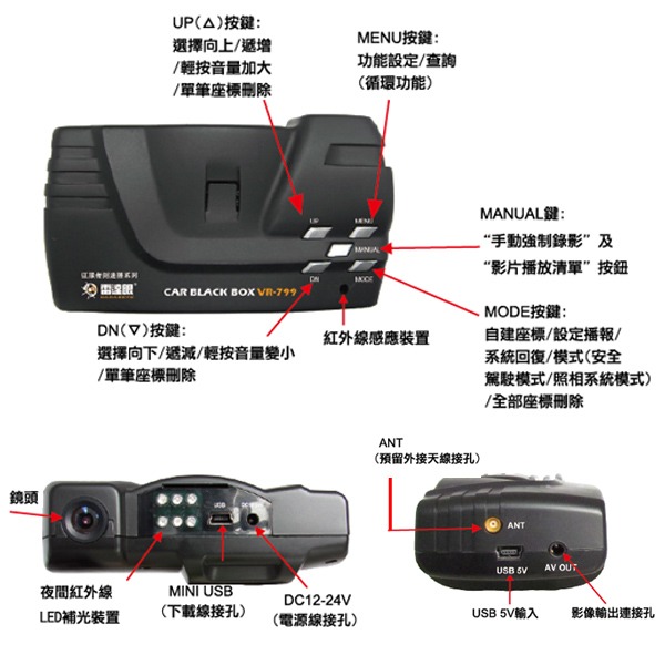 ●三機一體:結合GPS、行車記錄器、測速器,節省車內有限空間,並簡化線路架設。