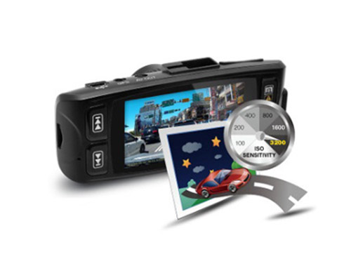 業界唯一ISO值可高達3200之行車記錄器,依照當下狀況自動調整感光度,即使在夜晚完全無路燈的狀態下,仍能看清楚前方視野,絕無暗角,解決夜晚因光源不足而視線不佳的問題。
